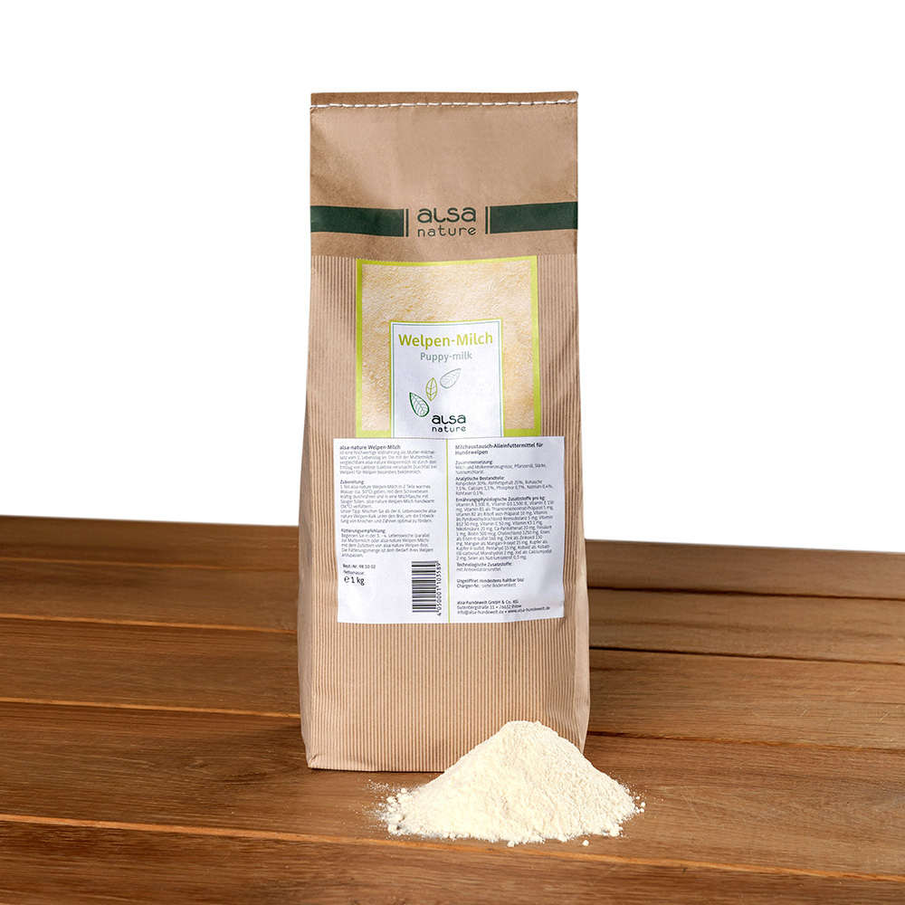 alsa-nature Puppy-melk – alsa-nature Puppymelk is een complete melkvervanger en daarmee een hoogwaardige voeding voor moederloze puppy’s of voor puppy’s waarbij de teef onvoldoende melk produceert, bijvoorbeeld bij een groot nest. Geschikt voor pups vanaf de 1ste levensdag. De lactose is bij deze met moedermelk vergelijkbare puppiemelk door middel van een speciaal proces onttrokken, waardoor de puppy’s de melk goed verdragen en de kans op diarree kleiner is (lactose veroorzaakt diarree). Ook geschikt ter voorbereiding op de lactatie-periode en voor werkhonden en honden voor de fok. Maar ook voor oude of zieke honden kan alsa-nature Puppymelk door de waardevolle ingrediënten een hoogwaardige toevoeging zijn.