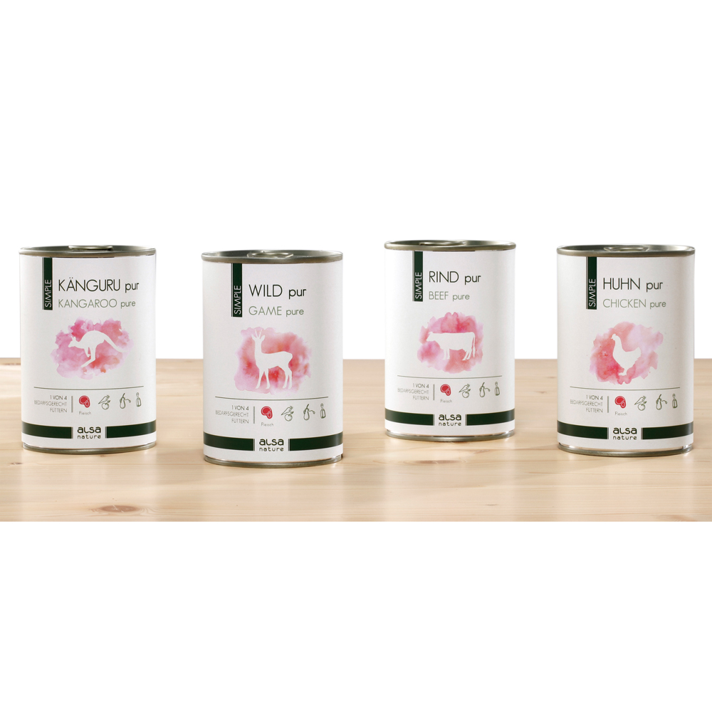 alsa-nature SIMPLE Vleesblikken-mix – ” Met alsa-nature SIMPLE kunt u zelf een individuele en op uw hond afgestemde voeding samenstellen. Kies in vier stappen uit verschillende pure vleessoorten, fruit- en groentebijlagen, gezonde oliën en mineralen de passende ingrediënten voor uw hond. Gecombineerd bieden de alsa-nature SIMPLE producten een volwaardige, natuurlijke en voedzame hondenvoeding. In deze vleesblikken-mix zitten de volgende soorten: 1 x alsa-nature SIMPLE Kip puur – 1 x alsa-nature SIMPLE Wild puur – 1 x alsa-nature SIMPLE Rund puur – 1 x alsa-nature SIMPLE Kangoeroe puur Dit is een mix van verschillende vleesblikken. De ingrediënten en voedingswaarden vindt u bij de desbetreffende afzonderlijke producten. ▶ alsa-nature SIMPLE overzicht “