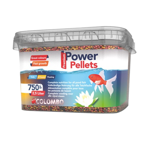 De Colombo Power Pellet 2,5 Liter is een compleet diervoeder voor al je vijvervissen. Deze premium pellets zijn van hoge kwaliteit en bevatten de juiste voedingsstoffen voor een gezonde groei en mooie kleuren. Dankzij het hogere soortelijk gewicht worden de pellets snel opgenomen door je vissen. De vierkante emmer met een hersluitbaar deksel zorgt ervoor dat het voer altijd vers blijft. Het is belangrijk om niet te overvoeren; geef alleen zoveel als je vissen in 5 minuten opeten en verwijder overtollig voer. Bewaar de emmer op een koele, droge plek voor de beste vershouding.