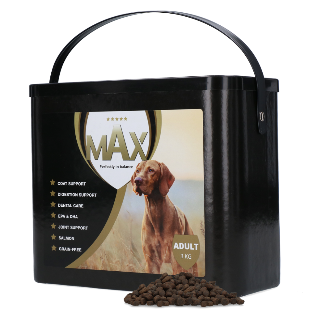 De uitgebalanceerde samenstelling van MAX is met zorg gekozen. Het smakelijke voer bevat alle ingrediënten, die uw hond MAXimaal ondersteunen. Zo stimuleert MAX de spijsvertering, draagt het bij aan de mobiliteit van uw hond en activeert MAX het afweersysteem. Dit alles komt de vitaliteit ten goede en geeft uw hond een diep glanzende vacht!