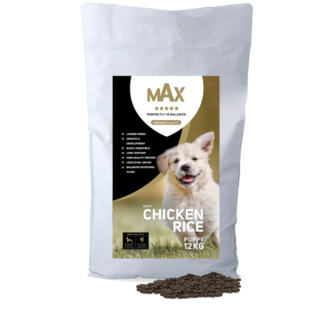 Max Puppy Geperste Brokken Kip & Rijst is volledig uitgebalanceerde, 5 sterren voeding voor puppy's en opgroeiende honden in de vorm van geperste brokken. Het helpt puppy's om in balans te blijven en het ondersteunt de groei en ontwikkeling. De geperste brokken zijn glutenvrij, makkelijk verteerbaar, blijven langer vers en ondersteunen de vacht. Daarnaast zijn ze verrijkt met omega 3, ze ondersteunen de gewrichten, ze dragen bij aan een gebalanceerde darmflora en het draagt bij aan het verminderen van winderigheid en de geur van de ontlasting.