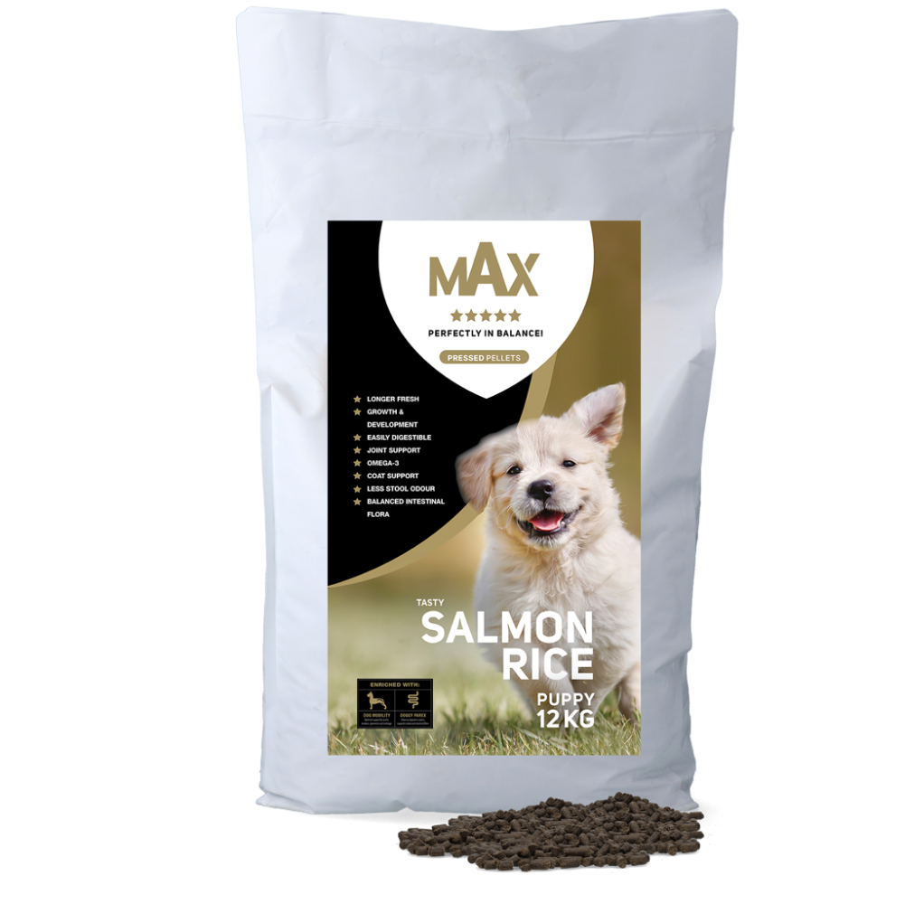 Max Puppy Geperste Brokken Zalm & Rijst is volledig uitgebalanceerde, 5 sterren voeding voor puppy's en opgroeiende honden in de vorm van geperste brokken. Het helpt puppy's om in balans te blijven en het ondersteunt de groei en ontwikkeling. De geperste brokken zijn glutenvrij, makkelijk verteerbaar, blijven langer vers en ondersteunen de vacht. Daarnaast zijn ze verrijkt met omega 3, ze ondersteunen de gewrichten, ze dragen bij aan een gebalanceerde darmflora en het draagt bij aan het verminderen van winderigheid en de geur van de ontlasting.