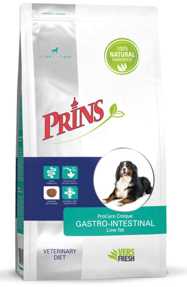Maagdarmproblemen, zoals diarree of wisselende ontlasting komen vaak voor bij honden. Bij maagdarmklachten is er meestal geen sprake van goed gevormde ontlasting, maar ook spugen wordt regelmatig gezien. Prins ProCare Croque Veterinary Diet Gastro-Intestinal Low fat is een volledige dieetvoeding voor honden met maag-darmproblemen…