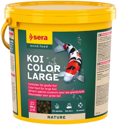 De Sera Koi Color Large – 3800 ml is een speciaal ontwikkelde voeding voor grotere koi, die hun kleuring optimaliseert en zorgt voor een gezonde ontwikkeling. Dit drijvende, bijzonder vormstabiele granulaat bevat 10% Spirulina, waardoor het bijdraagt aan levendigere kleuren en een gezonde groei. Het voer is rijk aan gammarus, krill, carotenoïden, omega-vetzuren, sporenelementen en goed verteerbare proteïnen. Het is een licht verteerbaar voer dat geschikt is voor volledige voeding het hele jaar door, zonder kleur- en conserveermiddelen. Het voer belast het water niet, waardoor het perfect is voor een schone vijver.