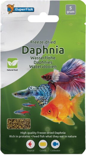 Superfish Freeze Dried Daphnia (gevriesdroogde watervlooien) is een natuurlijke en gezonde aanvulling op het dieet van jouw tropische vissen. Daphnia staat bekend als een uitstekende bron van natuurlijke vezels die de spijsvertering bevorderen. Door het kleine formaat zijn deze watervlooien ideaal voor bijna alle soorten tropische vissen.