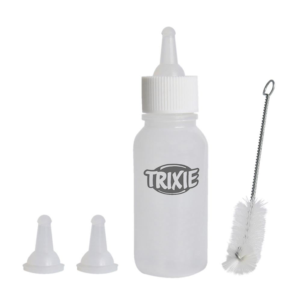 TRIXIE Puppy zuigfles-set – Deze zuigfles is ideaal om pasgeboren puppy’s of andere jonge dieren zonder moeder van vloeistof en voeding te voorzien. Makkelijk schoon te maken met de meegeleverde reinigingsborstel. Inclusief 3 bijbehorende siliconen spenen. Inhoud: 1 zuigfles, 3 siliconen spenen, 1 reinigingsborstel.